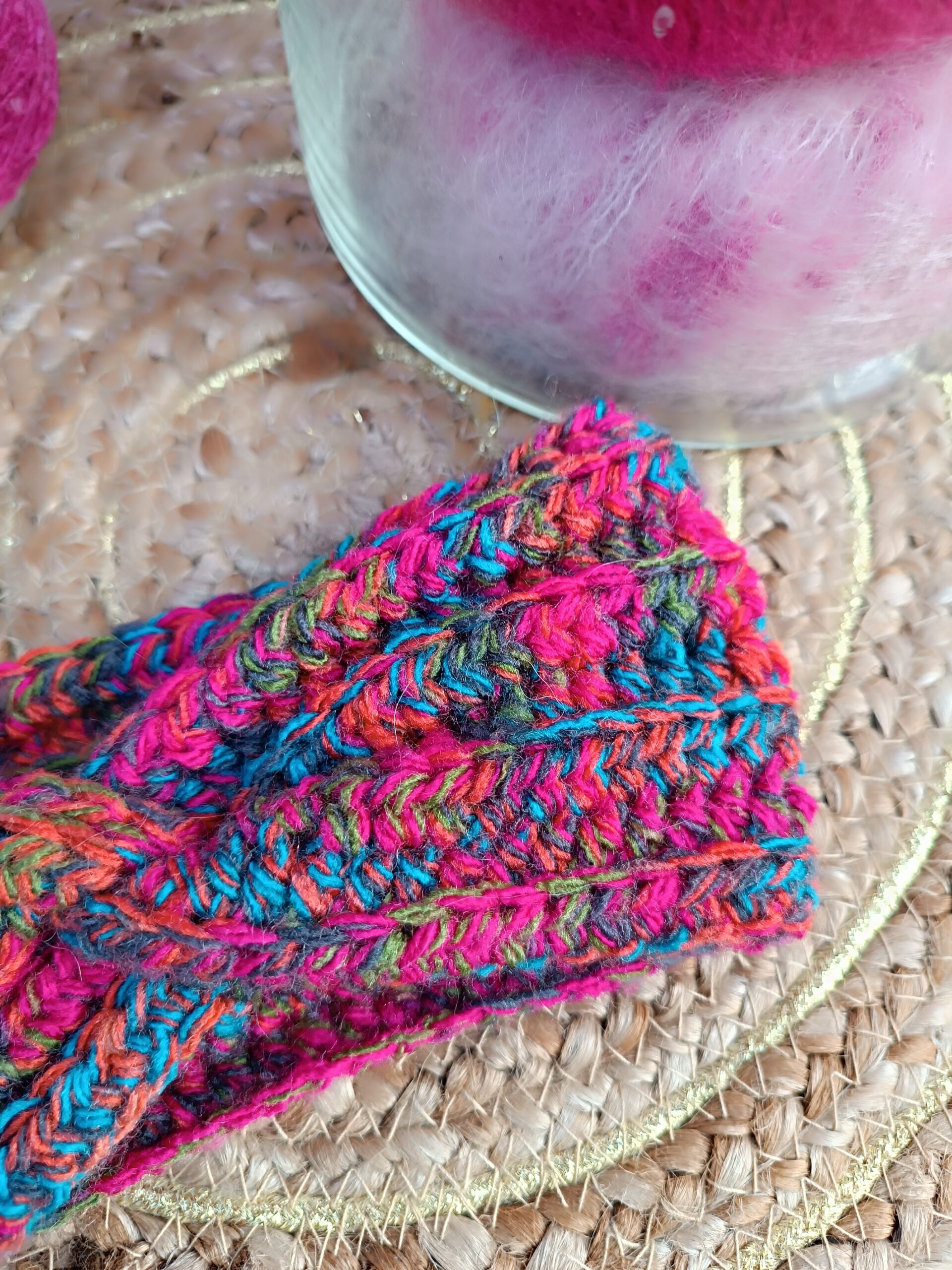 Chaque bandeau est unique : les pelotes utilisées proviennent de fins de stock, de dons ou de trouvailles chinées avec amour.