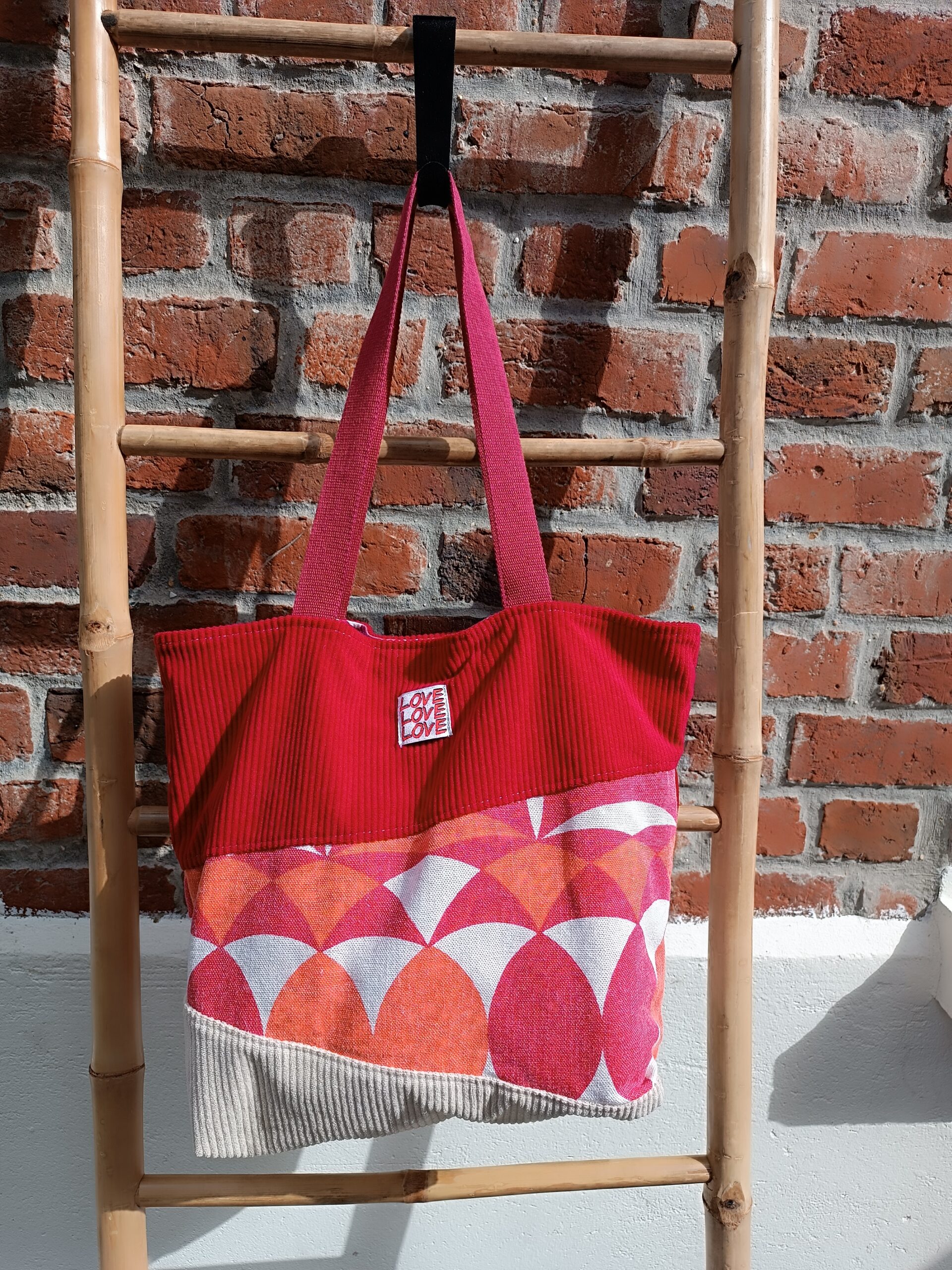 Ce sac cabas plein de peps est confectionné à partir d’un mélange de velours côtelé et de tissu d’ameublement, pour un style unique et engagé.
